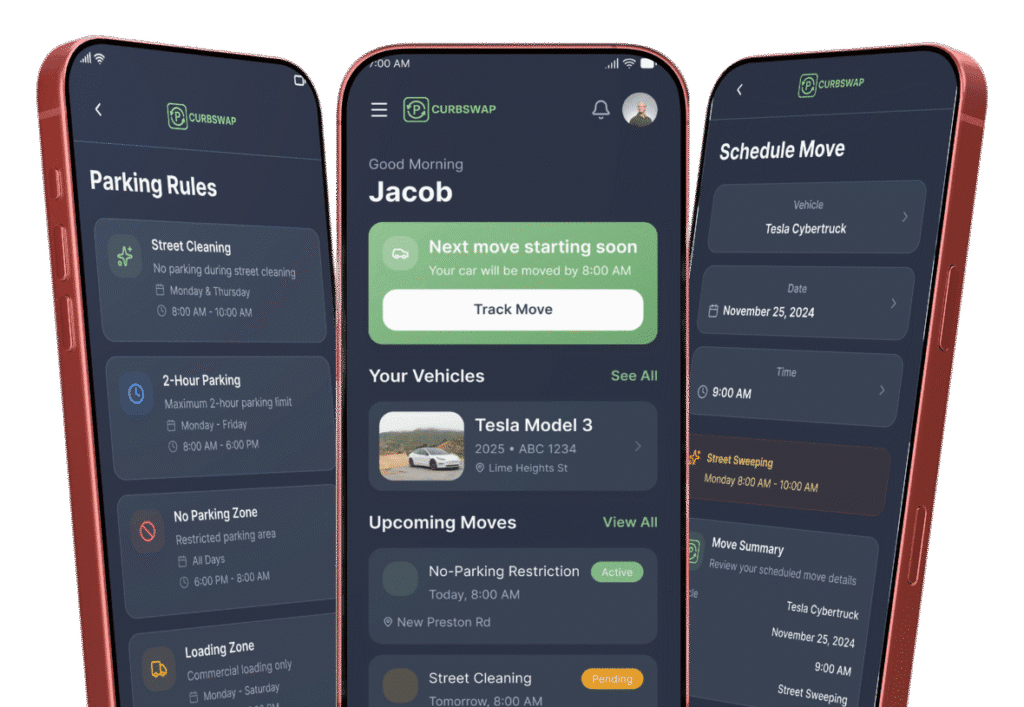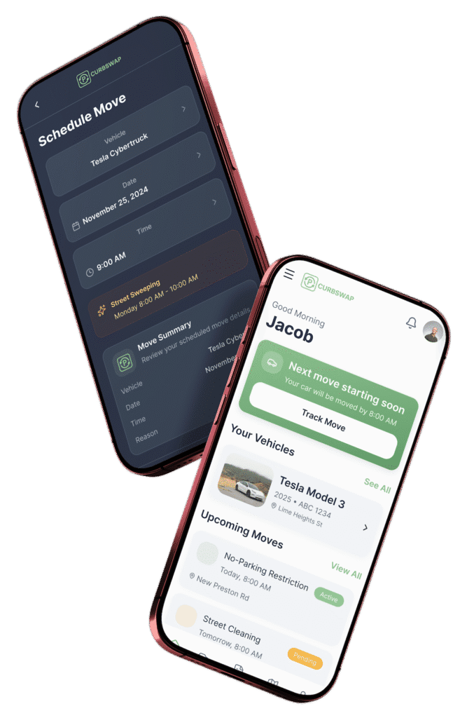 Curbswap tracks your parking restrictions, assigns a driver, relocates your car before enforcement windows begin, and sends you live photo + GPS confirmation. You stay Ticket-free!